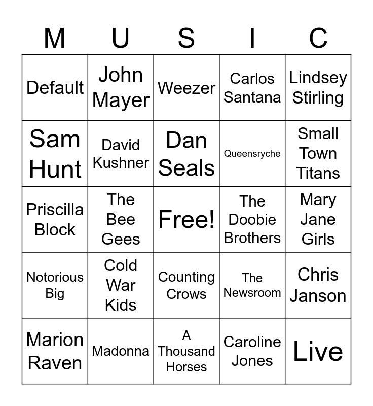 This bingo card has a free space and 57 words: Gladys Knight, Marion Raven, Mungo Jerry, Default, A Thousand Horses, Steely Dan, David Kushner, Blues Traveler, Queensryche, The Smashing Pumpkins, Carlos Santana, David Gilmour, Nazareth, Stacey Q, Don Henley, Tool, Lindsey Stirling, The Bee Gees, In Flames, Live, The Doobie Brothers, Orianthi, The Newsroom, Weezer, Type O Negative, Dan Seals, Flyleaf, Oingo Boingo, Small Town Titans, Golden Earring, Prince, Smith-Kotzen, Ace of Base, Rush, Mary Jane Girls, Sam Hunt, Michael Jackson, Priscilla Block, Frank Sinatra, Notorious Big, John Mayer, Counting Crows, Johnny Nash, Otherwise, Pharrell Williams, Thin Lizzy, Cold War Kids, Madonna, Collective Soul, Dee-Lite, Harry Belafonte, Caroline Jones, Grace Potter & The Nocturnals, Phillip Phillips, Chevelle, Chris Janson and Disturbed.