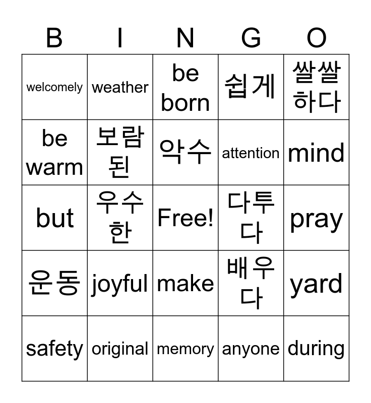 This bingo card has a free space and 36 words: 고소한, 도착하다, 자랑스럽다, 보람된, 배우다, 운동, 악수, 응원하다, 쌀쌀하다, 칭찬하다, 우수한, 쉽게, 매일, 다투다, mind, welcomely, grow, joyful, during, be born, pray, yard, original, safety, memory, weather, but, play, attention, be warm, fresh, history, anyone, make, especially and the first.