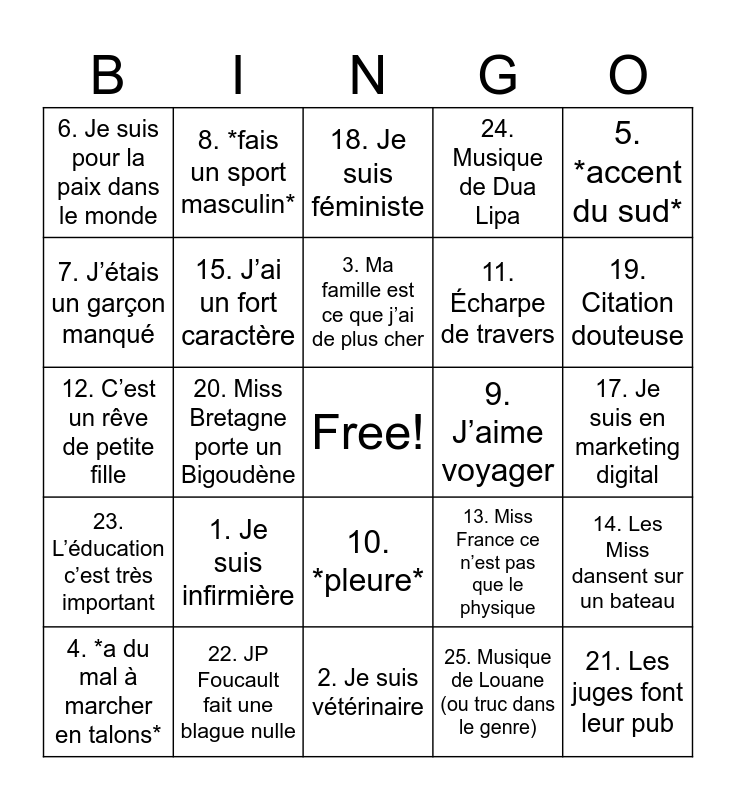 This bingo card has a free space and 25 words: 1. Je suis infirmière, 2. Je suis vétérinaire, 3. Ma famille est ce que j’ai de plus cher, 4. *a du mal à marcher en talons*, 5. *accent du sud*, 6. Je suis pour la paix dans le monde, 7. J’étais un garçon manqué, 8. *fais un sport masculin*, 9. J’aime voyager, 10. *pleure*, 11. Écharpe de travers, 12. C’est un rêve de petite fille, 13. Miss France ce n’est pas que le physique, 14. Les Miss dansent sur un bateau, 15. J’ai un fort caractère, 16. Je suis pétillante et souriante, 17. Je suis en marketing digital, 18. Je suis féministe, 19. Citation douteuse, 20. Miss Bretagne porte un Bigoudène, 21. Les juges font leur pub, 22. JP Foucault fait une blague nulle, 23. L’éducation c’est très important, 24. Musique de Dua Lipa and 25. Musique de Louane (ou truc dans le genre).