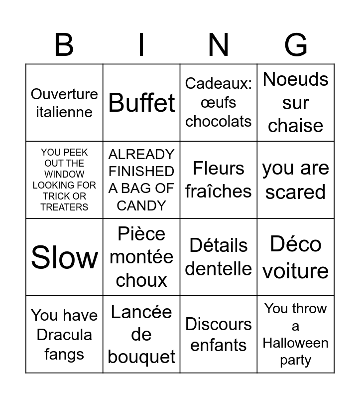 This bingo card has 25 words: Jeux des 12 mois, Costume bleu, Détails dentelle, Noms sur bois, Ouverture italienne, Buffet, Cadeaux: œufs chocolats, Noeuds sur chaise, Slow, Pièce montée choux, Discours enfants, Déco voiture, Gratin d’auphinois, Lancée de bouquet, Fleurs fraîches, Kenji, You have Dracula fangs, ALREADY FINISHED A BAG OF CANDY, Halloween is your favorite holiday, You throw a Halloween party, YOU PEEK OUT THE WINDOW LOOKING FOR TRICK OR TREATERS, programmed your doorbell to play spooky Halloween sounds, you started planning for Halloween in September, you are scared and Carved a pumpkin.