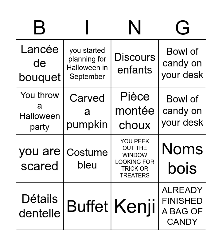This bingo card has 30 words: Jeux 12 mois, Noeuds chaises, Noms bois, Slow, Lancée de bouquet, Discours enfants, Pièce montée choux, Ouverture italienne, Buffet, Cadeaux œufs chocolats, Kenji, Détails dentelle, Gratin dauphinois, Fleurs fraîches, Costume bleu, Déco voiture, You have Dracula fangs, ALREADY FINISHED A BAG OF CANDY, Halloween is your favorite holiday, You throw a Halloween party, YOU PEEK OUT THE WINDOW LOOKING FOR TRICK OR TREATERS, programmed your doorbell to play spooky Halloween sounds, you started planning for Halloween in September, you are scared, Carved a pumpkin, Bowl of candy on your desk, Bowl of candy on your desk, Bowl of candy on your desk, Bowl of candy on your desk and Bowl of candy on your desk.