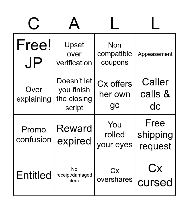 This bingo card has 16 words: Entitled, No receipt/damaged item, Non compatible coupons, Appeasement, Over explaining, Upset over verification, You rolled your eyes, Free shipping request, Free! JP, Doesn’t let you finish the closing script, Cx overshares, Caller calls & dc, Promo confusion, Reward expired, Cx offers her own gc and Cx cursed.