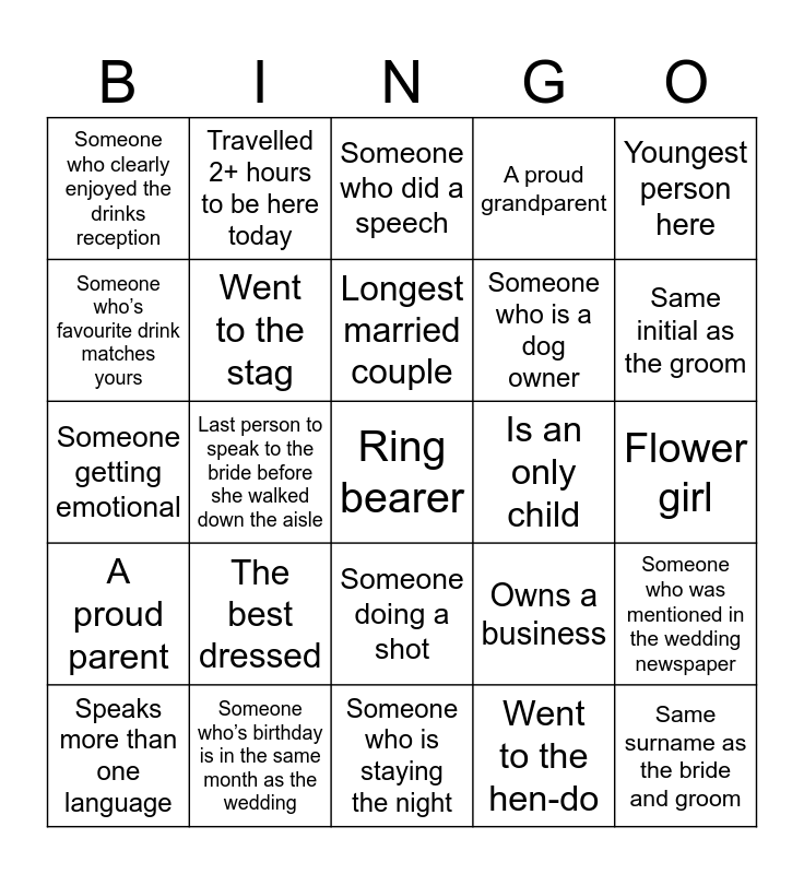 This bingo card has 33 words: Same surname as the bride and groom, Most recently married, Last person to speak to the bride before she walked down the aisle, The best man, A proud parent, Went to the stag, Youngest person here, Speaks more than one language, Travelled 2+ hours to be here today, The two bridesmaid and the groomsmen couples, Longest married couple, Someone who did a speech, Free!, Same initial as the bride, Is an only child, Same initial as the groom, Someone who’s birthday is in the same month as the wedding, Someone getting emotional, The best dressed, Owns a business, Someone doing a shot, Maid of honour, Someone who clearly enjoyed the drinks reception, Flower girl, Someone who is staying the night, Ring bearer, A proud grandparent, Someone who is a dog owner, Someone who’s favourite drink matches yours, Someone who was mentioned in the wedding newspaper, The oldest guest, Went to the hen-do and The best dancer.