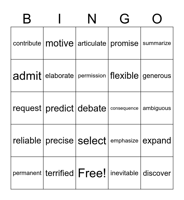 This bingo card has 31 words: Free!, evaluate, predict, efficient, contribute, articulate, elaborate, emphasize, consequence, inevitable, ambiguous, debate, discover, recommend, generous, creative, expand, precise, reliable, select, summarize, temporary, permanent, motive, flexible, admit, promise, request, terrified, permission and accurate.