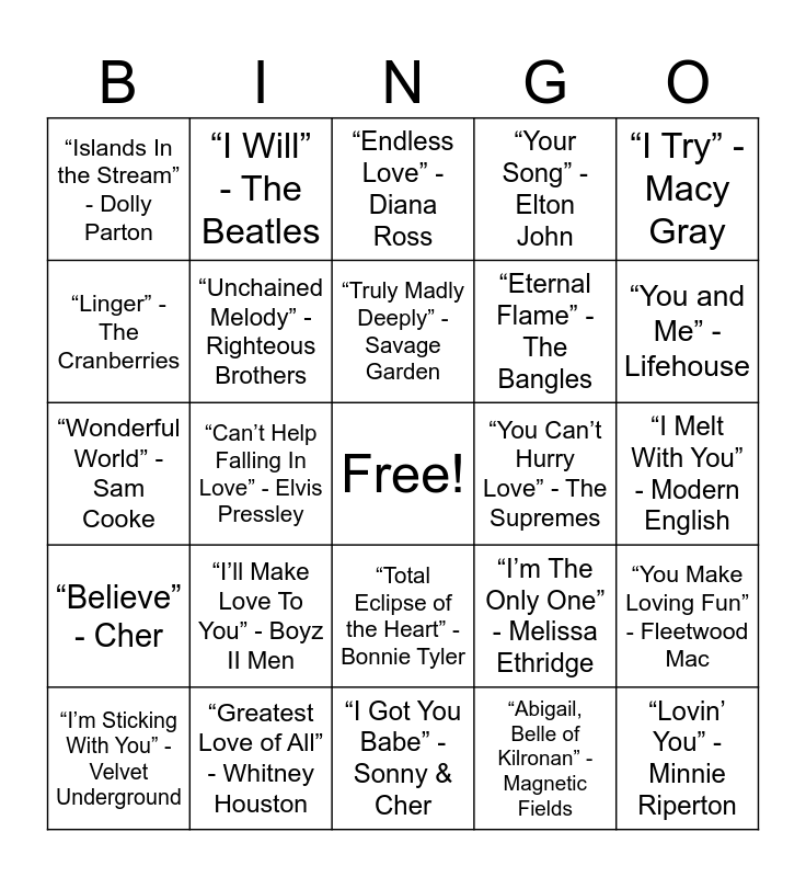 This bingo card has a free space and 41 words: “Silly Love Songs” - Paul McCartney, “Wonderful World” - Sam Cooke, “I Want to Know What Love Is” - Foreigner, “Unchained Melody” - Righteous Brothers, “Greatest Love of All” - Whitney Houston, “Total Eclipse of the Heart” - Bonnie Tyler, “Truly Madly Deeply” - Savage Garden, “Alone” - Heart, “I Try” - Macy Gray, “Believe” - Cher, “Can’t Help Falling In Love” - Elvis Pressley, “Your Song” - Elton John, “Lovin’ You” - Minnie Riperton, “I Melt With You” - Modern English, “You Can’t Hurry Love” - The Supremes, “I’ll Make Love To You” - Boyz II Men, “Something” - The Beatles, “Islands In the Stream” - Dolly Parton, “God Only Knows” - Beach Boys, “Endless Love” - Diana Ross, “You Make Loving Fun” - Fleetwood Mac, “Let’s Stay Together” - Al Green, “I Got You Babe” - Sonny & Cher, “Eternal Flame” - The Bangles, “Thinkin Bout You” - Frank Ocean, “Say Yes” - Elliott Smith, “Abigail, Belle of Kilronan” - Magnetic Fields, “This Must Be the Place” - Talking Heads, “You and Me” - Lifehouse, “All I Have To Do Is Dream” - Everly Brothers, “That’s Amore” - Dean Martin, “I Will” - The Beatles, “I’m Sticking With You” - Velvet Underground, “Still The One” - Shania Twain, “I’m The Only One” - Melissa Ethridge, “Linger” - The Cranberries, “A Thousand Miles” - Vanessa Carlton, “I’m Gonna Be (500 Miles)” - The Proclaimers, “Romeo and Juliet” - Dire Straits, “Thank You” - Dido and “Just the Way You Are” - Billy Joel.