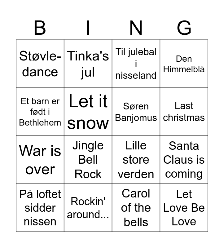This bingo card has 24 words: Guld jul, Jul det cool, Last christmas, Glade jul, dejlige jul, Et barn er født i Bethlehem, Støvle-dance, Let it snow, Tinka's jul, Rockin' around..., Rudolf med den røde tud, War is over, Lille store verden, It's beginning to look..., Jeg så julemanden kysse..., Søren Banjomus, Driving home for christmas, Carol of the bells, Til julebal i nisseland, Jingle Bell Rock, Santa Claus is coming, På loftet sidder nissen, Let Love Be Love, Den Himmelblå and Højt fra træet grønne top.