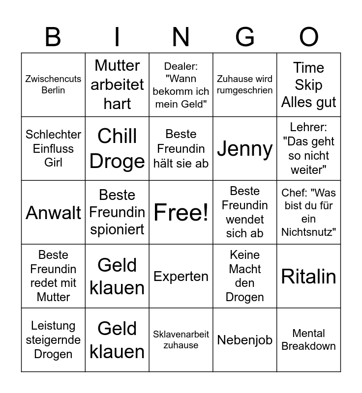 This bingo card has a free space and 24 words: Geld klauen, Geld klauen, Beste Freundin hält sie ab, Leistung steigernde Drogen, Time Skip Alles gut, Zwischencuts Berlin, Schlechter Einfluss Girl, Mutter arbeitet hart, Beste Freundin wendet sich ab, Experten, Jenny, Anwalt, Keine Macht den Drogen, Ritalin, Chill Droge, Nebenjob, Chef: "Was bist du für ein Nichtsnutz", Dealer: "Wann bekomm ich mein Geld", Lehrer: "Das geht so nicht weiter", Beste Freundin spioniert, Mental Breakdown, Beste Freundin redet mit Mutter, Zuhause wird rumgeschrien and Sklavenarbeit zuhause.