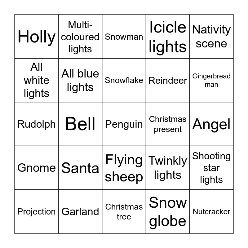 This bingo card has 25 words: Santa, Christmas tree, Snowflake, Projection, Nativity scene, Holly, All white lights, Multi-coloured lights, Christmas present, Flying sheep, Reindeer, Rudolph, Twinkly lights, Shooting star lights, All blue lights, Nutcracker, Angel, Snowman, Gingerbread man, Bell, Penguin, Garland, Gnome, Icicle lights and Snow globe.