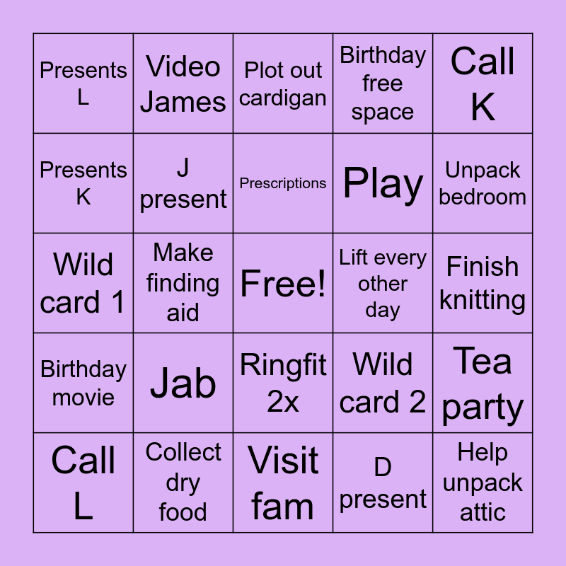 This bingo card has a free space and 24 words: Jab, Collect dry food, Prescriptions, Call L, Call K, Presents L, Presents K, Video James, Lift every other day, Ringfit 2x, Play, Wild card 1, Wild card 2, Tea party, J present, D present, Finish knitting, Plot out cardigan, Unpack bedroom, Make finding aid, Help unpack attic, Birthday movie, Birthday free space and Visit fam.