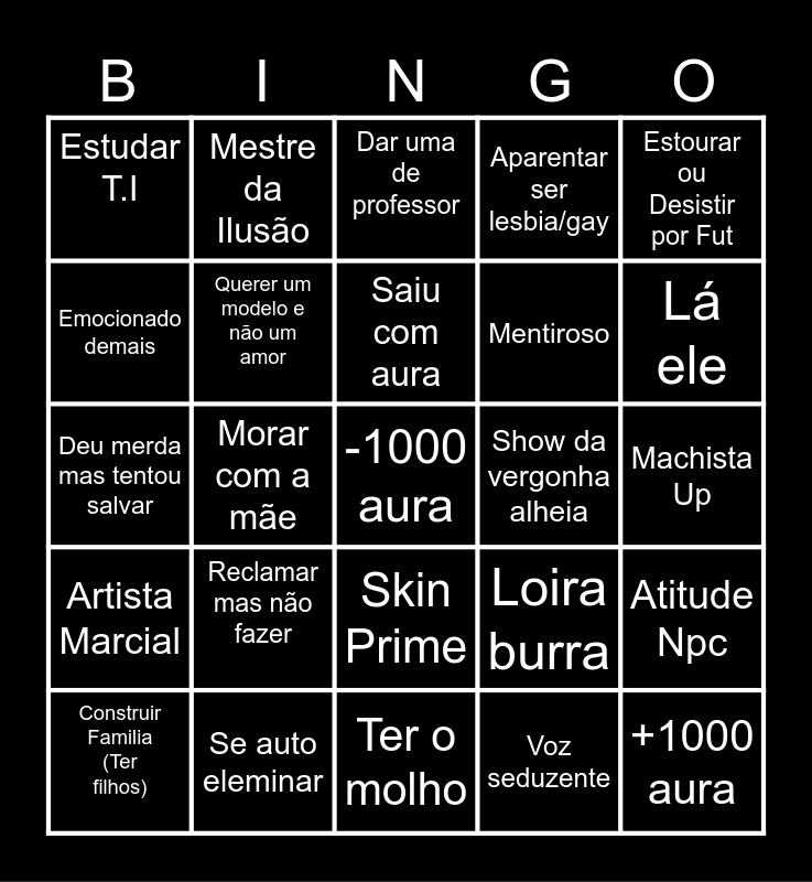 This bingo card has a free space and 29 words: Construir Familia (Ter filhos), Gostar de parte aleatoria da mulher, Morar com a mãe, Gostar da ex, Estudar T.I, Dar uma de professor, Querer um modelo e não um amor, Reclamar mas não fazer, Show da vergonha alheia, Se auto eleminar, Machista Up, +1000 aura, Ter o molho, Voz seduzente, Lá ele, Ser Calvo, Skin Prime, Artista Marcial, Estourar ou Desistir por Fut, Deu merda mas tentou salvar, Loira burra, Entrou e já pode sair, Mentiroso, Emocionado demais, Aparentar ser lesbia/gay, Mestre da Ilusão, Atitude Npc, Saiu com aura and Atitude com Ego.