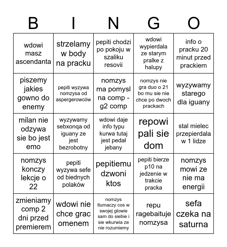 This bingo card has a free space and 24 words: pepiti wyzywa sefe od biednych polaków, wdowi nie chce grac omenem, nomzys ma pomysl na comp - g2 comp, zmieniamy comp 2 dni przed premierem, info o pracku 20 minut przed prackiem, wdowi masz ascendanta, piszemy jakies gowno do enemy, strzelamy w body na pracku, repowi pali sie dom, pepitiemu dzwoni ktos, nomzys nie gra duo o 21 bo mu sie nie chce po dwoch prackach, milan nie odzywa sie bo jest emo, pepiti bierze p10 na jedzenie w trakcie pracka, nomzys mowi ze nie ma energii, pepiti wyzywa nomzysa od aspergerowców, repu ragebaituje nomzysa, stal mielec przepierdala w 1 lidze, pepiti chodzi po pokoju w szaliku resovii, wyzywamy starego dla iguany, wyzywamy sebxonqa od iguany ze jest bezrobotny, sefa czeka na saturna, nomzys konczy lekcje o 22, wdowi wypierdala ze starym pralke z halupy and nomzys tlumaczy cos w swojej glowie sam do siebie i sie wkurwia ze nie rozumiemy.