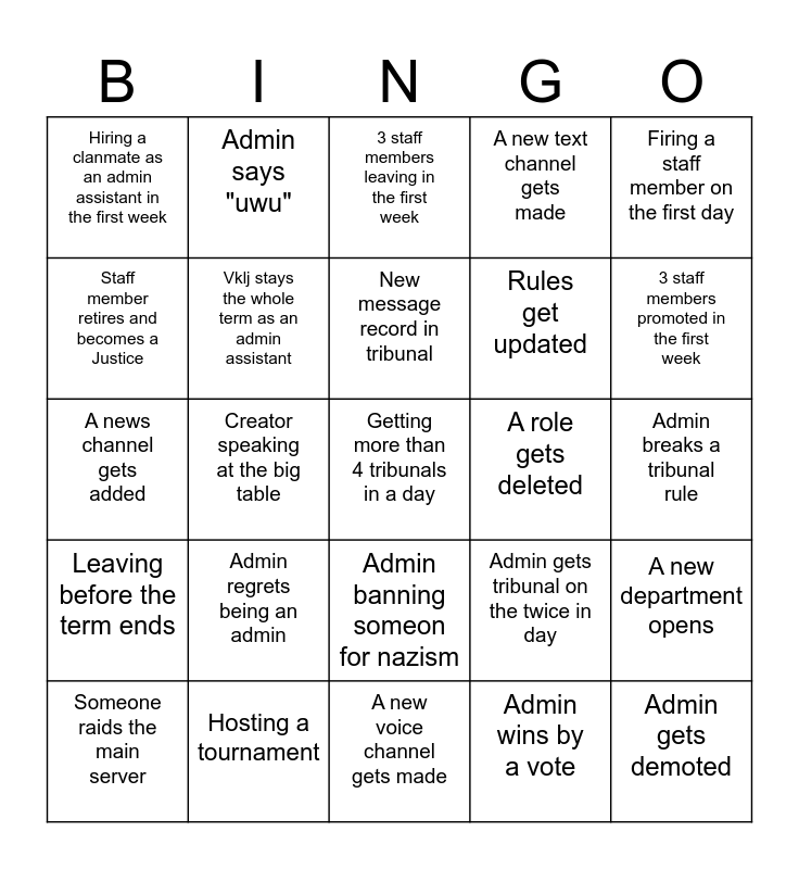 This bingo card has 25 words: Leaving before the term ends, Hosting a tournament, Getting more than 4 tribunals in a day, Admin wins by a vote, Firing a staff member on the first day, Hiring a clanmate as an admin assistant in the first week, Admin says "uwu", 3 staff members leaving in the first week, A role gets deleted, A new department opens, Staff member retires and becomes a Justice, Vklj stays the whole term as an admin assistant, A new voice channel gets made, Admin gets tribunal on the twice in day, 3 staff members promoted in the first week, Someone raids the main server, Creator speaking at the big table, New message record in tribunal, Rules get updated, Admin breaks a tribunal rule, A news channel gets added, Admin regrets being an admin, Admin banning someon for nazism, A new text channel gets made and Admin gets demoted.