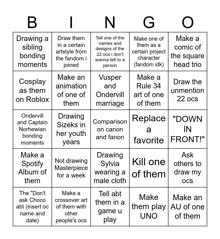 This bingo card has a free space and 24 words: Not drawing Masterpiece for a week, Make a crossover art of them with other people's ocs, Vusper and Ondervill marriage, The "Don't ask Choco abt (insert oc name and date), Make a comic of the square head trio, Drawing a sibling bonding moments, Cosplay as them on Roblox, Draw them in a certain artstyle from the fandom i joined, Replace a favorite, Drawing Sylvia wearing a male cloth, Make a Rule 34 art of one of them, Ondervill and Captain Norhewian bonding moments, Kill one of them, Ask others to draw my ocs, Make an animation of one of them, Make them play UNO, "DOWN IN FRONT!", Tell one of the names and designs of the 22 ocs i don't wanna tell to a person, Draw the unmention 22 ocs, Drawing Sizeks in her youth years, Make an AU of one of them, Make a Spotify Album of them, Make one of them as a certain project character (fandom idk) and Tell abt them in a game u play.