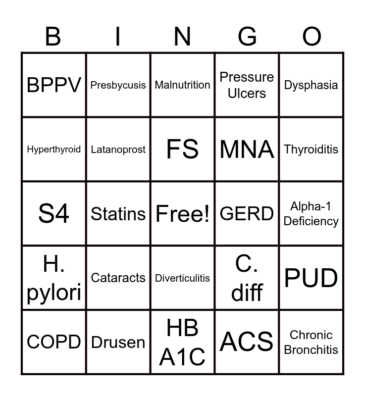 This bingo card has a free space and 24 words: Cataracts, Drusen, FS, COPD, Dysphasia, BPPV, Hyperthyroid, Presbycusis, GERD, Diverticulitis, MNA, S4, C. diff, PUD, Latanoprost, ACS, Alpha-1 Deficiency, Malnutrition, Thyroiditis, Statins, Chronic Bronchitis, H. pylori, Pressure Ulcers and HB A1C.