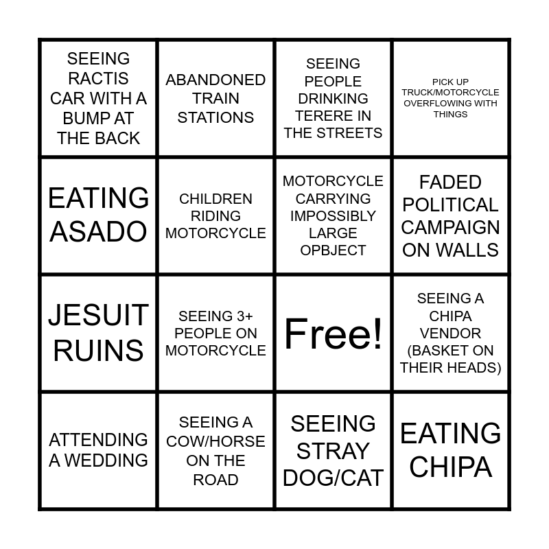 This bingo card has 19 words: Free!, DRINKING TERERE, SEEING PEOPLE DRINKING TERERE IN THE STREETS, EATING CHIPA, SEEING A CHIPA VENDOR (BASKET ON THEIR HEADS), EATING ASADO, SEEING STRAY DOG/CAT, SEEING RACTIS CAR WITH A BUMP AT THE BACK, ABANDONED TRAIN STATIONS, JESUIT RUINS, SEEING 3+ PEOPLE ON MOTORCYCLE, CHILDREN RIDING MOTORCYCLE, MOTORCYCLE CARRYING IMPOSSIBLY LARGE OPBJECT, SEEING A COW/HORSE ON THE ROAD, ATTENDING A WEDDING, EATING EMPANADA, PICK UP TRUCK/MOTORCYCLE OVERFLOWING WITH THINGS, FADED POLITICAL CAMPAIGN ON WALLS and SOMEONE NAPPING ON A HAMMOCK.