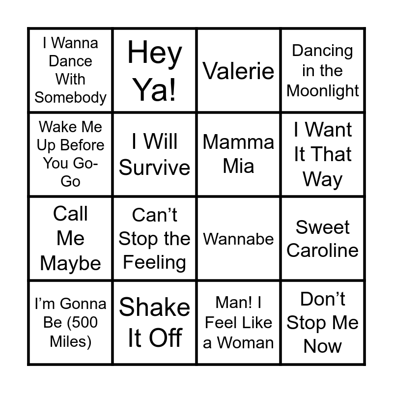 This bingo card has 31 words: Free!, Dancing Queen, Sweet Caroline, Don’t Stop Believin’, I Wanna Dance With Somebody, Valerie, Mamma Mia, Mr. Brightside, Shake It Off, Livin’ On a Prayer, Man! I Feel Like a Woman, I’m Gonna Be (500 Miles), Teenage Dirtbag, Uptown Funk, Can’t Stop the Feeling, Happy, Shotgun, Proud Mary, Don’t Stop Me Now, Walking on Sunshine, Wake Me Up Before You Go-Go, Footloose, Love Shack, Hey Ya!, Call Me Maybe, I Will Survive, Dancing in the Moonlight, Wannabe, Everybody (Backstreet’s Back), I Want It That Way and Firework.