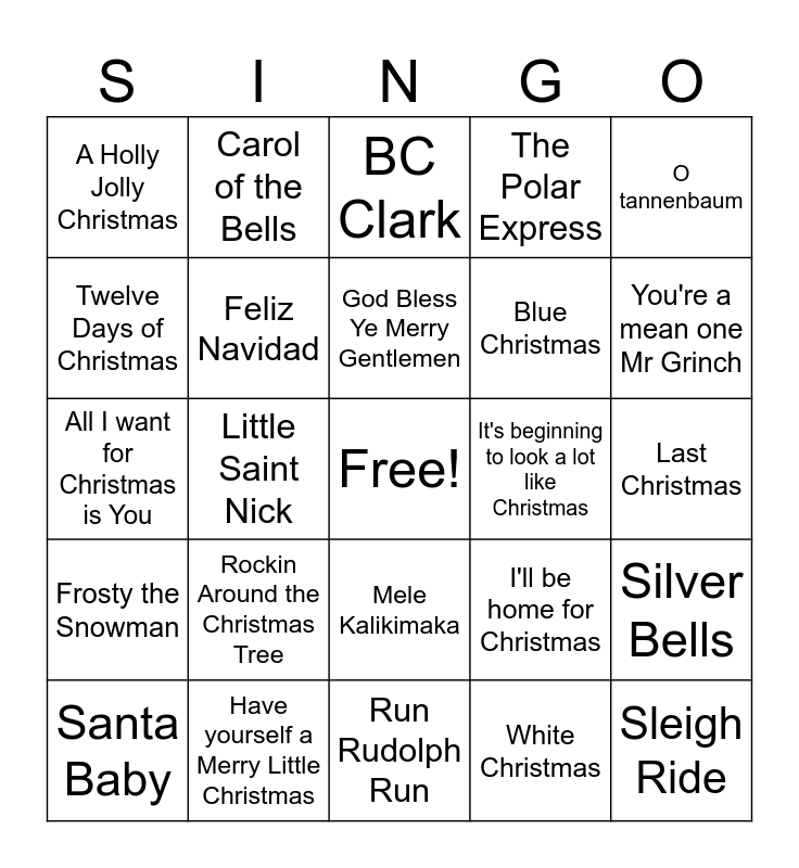 This bingo card has a free space and 29 words: Santa Baby, Jingle Bell Rock, Little Saint Nick, Let it Snow! Let it Snow! Let it Snow!, A Holly Jolly Christmas, BC Clark, Feliz Navidad, Rockin Around the Christmas Tree, It's beginning to look a lot like Christmas, Have yourself a Merry Little Christmas, Last Christmas, Sleigh Ride, Run Rudolph Run, White Christmas, You're a mean one Mr Grinch, Th Nutcracker, Mele Kalikimaka, Frosty the Snowman, O tannenbaum, All I want for Christmas is You, I'll be home for Christmas, Rudolph the Red Nosed Reindeer, Blue Christmas, Twelve Days of Christmas, The Polar Express, Carol of the Bells, Silver Bells, God Bless Ye Merry Gentlemen and I want a Hippopotamus For Christmas.
