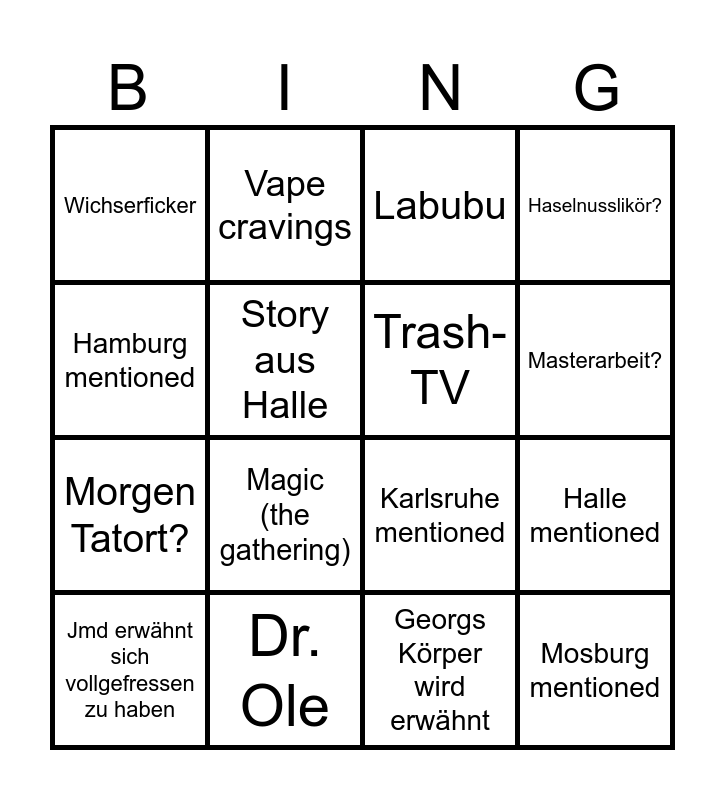 This bingo card has 19 words: Karlsruhe mentioned, six seven, Labubu, Mosburg mentioned, Halle mentioned, Hamburg mentioned, Georgs Körper wird erwähnt, Wichserficker, Vape cravings, Morgen Tatort?, Magic (the gathering), Story aus Halle, Trash-TV, Dr. Ole, Jmd erwähnt sich vollgefressen zu haben, Lob für das Essen, Haselnusslikör?, Masterarbeit? and was geht an Silvester?.