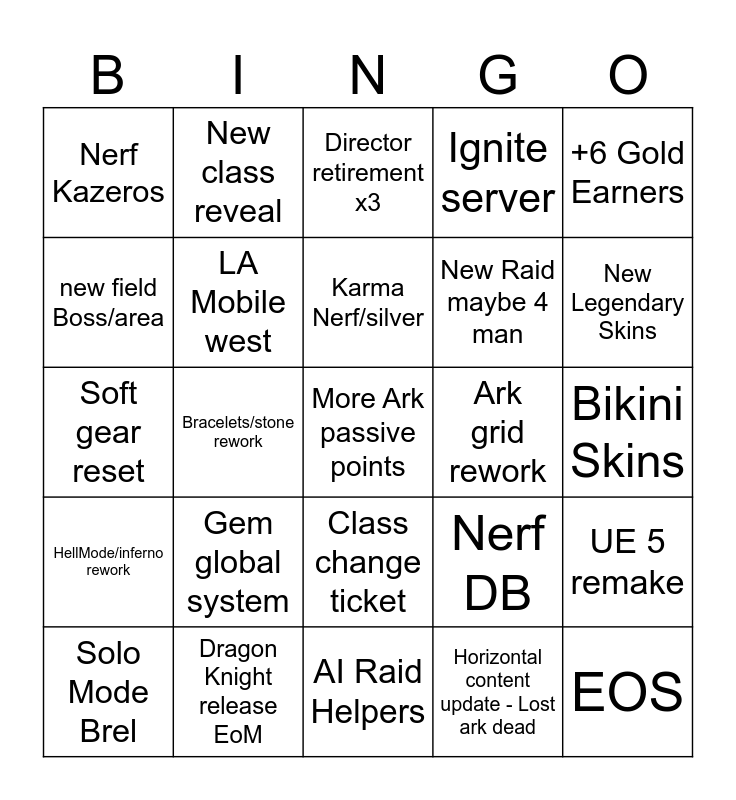 This bingo card has 25 words: Gem global system, AI Raid Helpers, Karma Nerf/silver, Solo Mode Brel, +6 Gold Earners, Nerf Kazeros, new field Boss/area, New class reveal, Ark grid rework, Class change ticket, New Raid maybe 4 man, Soft gear reset, Nerf DB, UE 5 remake, LA Mobile west, EOS, Bikini Skins, Director retirement x3, New Legendary Skins, Bracelets/stone rework, More Ark passive points, Dragon Knight release EoM, HellMode/inferno rework, Ignite server and Horizontal content update - Lost ark dead.