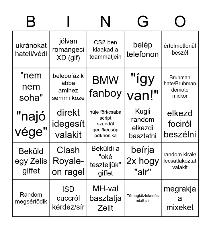 This bingo card has a free space and 29 words: Random megsértődik, Antiszoc (egyedül játszik/nem jön vc), direkt idegesít valakit, kreténkedik, ukránokat hateli/védi, CS2-ben kiaakad a teammatjein, belepofázik abba amihez semmi köze, Clash Royale-on ragel, Kugli random elkezdi basztatni, ISD cuccról kérdez/sír, elkezd fociról beszélni, megrakja a mixeket, MH-val basztatja Zelit, Tömegközlekedés miatt sír, Bruhman hate/Bruhman demote mickor, Random elkezd valamit RPzni, Beküldi a "oké teszteljük" giffet, Beküld egy Zelis giffet, értelmetlenül beszél, "najó vége", beírja 2x hogy "alr", ignorál valakit (nem válaszol), "így van!", "nem nem soha", belép telefonon, jólvan romángeci XD (gif), random kirak/ lecsatlakoztat valakit, BMW fanboy and "digga".