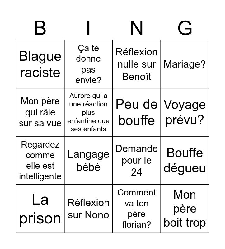 This bingo card has 16 words: Réflexion sur Nono, Bouffe dégueu, Réflexion nulle sur Benoît, Blague raciste, Regardez comme elle est intelligente, Ça te donne pas envie?, Demande pour le 24, Comment va ton père florian?, Mon père qui râle sur sa vue, Aurore qui a une réaction plus enfantine que ses enfants, La prison, Mariage?, Langage bébé, Voyage prévu?, Peu de bouffe and Mon père boit trop.