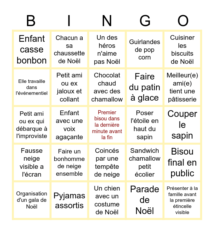 This bingo card has a free space and 63 words: 5 personnes portent un bonnet de Noël sur le même plan, Aller au marché de Noël, Au moins 2 acteurs refaits, Bisou final en public, Bisou sous la boule de gui, Casse noisette, Chacun a sa chaussette de Noël, Chamallow grillé, Chocolat chaud avec des chamallow, Chorale de Noël, Coincés par une tempête de neige, Concours de Noël, Couper le sapin, Cuisiner les biscuits de Noël, Décorer le sapin, Elle travaille dans l'événementiel, Enfant avec une voix agaçante, Enfant casse bonbon, Enfant entremetteur, Faire du patin à glace, Faire un bonhomme de neige ensemble, Fausse neige visible a l'écran, Guirlandes de pop corn, Héroïne citadine revient dans son village, Héros ébloui devant l'autre en tenue de fête, Il est bricolo, Il neige à gros flocons, Les proches comprennent avant les héros qu'ils sont faits l'un pour l'autre, L'un des héros est carriériste, Lutin de Noël, Maison en pain d'épice, Mal emballer des cadeaux, Meilleur(e) ami(e) entremetteur, Meilleur(e) ami(e) tient un café, Meilleur(e) ami(e) tient une pâtisserie, Organisation d'un gala de Noël, Organisation d'un spectacle de Noël, Parade de Noël, Père Noël, Petit ami ou ex jaloux et collant, Petit ami ou ex qui débarque à l'improviste, Poser l'étoile en haut du sapin, Poser un ange en haut du sapin, Premier plan sur une grande ville, Présenter à la famille avant la première étincelle visible, Pyjamas assortis, Repas de Noël avec 10+ personnes, Sandwich chamallow petit écolier, Soirée d'illumination du sapin de la ville, Tout le monde est parfaitement coiffé du début à la fin, Tradition de Noël familiale, Un chien avec un costume de Noël, Un des héros a un manteau rouge, Un des héros abandonne sa vie pour l'autre, Un des héros est un obsédé de Noël, Un des héros n'aime pas Noël, Un des héros porte un pull de Noël, Un gros malentendu, Un patron abusif, Un poinsettia, Une bataille de boules de neige, Une personne âgée sage et gentille and Veuf-ve depuis 3 ans ou +.