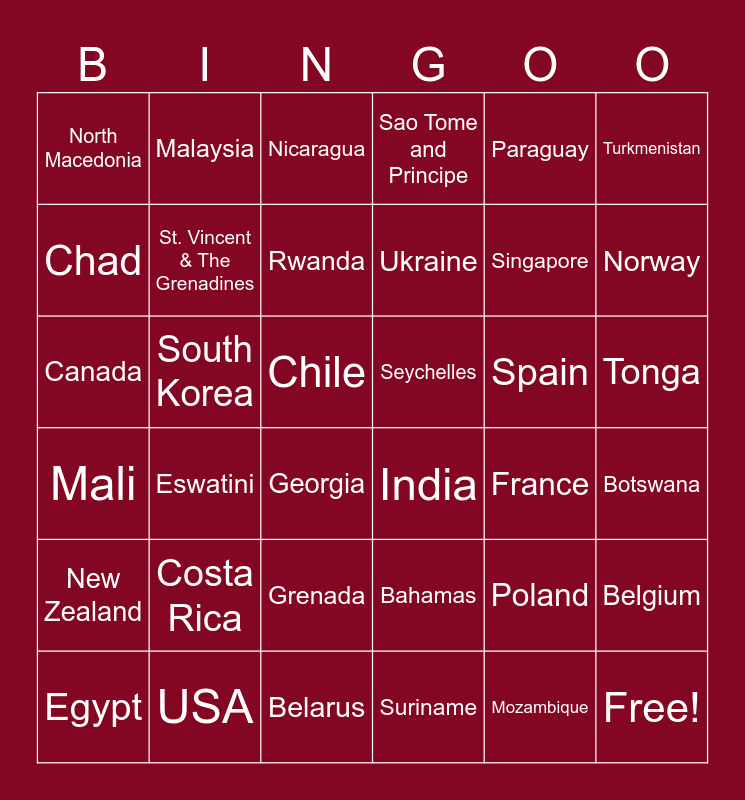 This bingo card has 42 words: Mozambique, St. Vincent & The Grenadines, United Kingdom, Spain, Botswana, Eswatini, Canada, Comoros, Nicaragua, Tonga, Chile, Ukraine, Norway, Paraguay, USA, Mali, Belgium, Singapore, Free!, Malaysia, Turkmenistan, Grenada, New Zealand, North Macedonia, Qatar, Egypt, Rwanda, Uzbekistan, Costa Rica, Poland, Mauritania, Seychelles, Chad, France, Belarus, Georgia, India, South Korea, Bahamas, Suriname, Sao Tome and Principe and Cameroon.