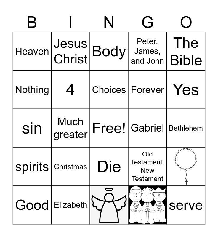 This bingo card has 3 images, a free space and 21 words: Christmas, Elizabeth, Choices, Good, The Bible, Heaven, Nothing, Jesus Christ, Gabriel, Die, Forever, sin, Old Testament, New Testament, 4, Bethlehem, Body, Yes, Much greater, serve, spirits and Peter, James, and John.