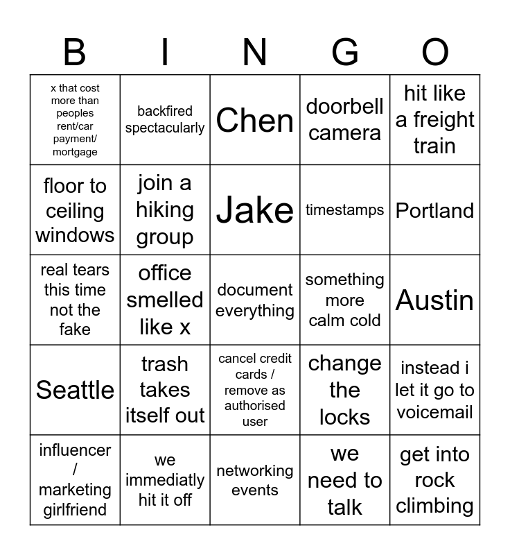 This bingo card has 84 words: Morrison, Henderson, Chen, Marcus, Tyler, Jessica, House/lease only in my name, mascara streaming down her face, the irony wasn't lost on me, beat up honda, Riverside, manila folder, join a hiking group, something more calm cold, smile that didn't reach eyes, x that cost more than peoples rent/car payment/ mortgage, influencer / marketing girlfriend, floor to ceiling windows, bought before the relationship, post deleted but screenshots circle, face went through several emotions, timestamps, document everything, social media smear campaign, office smelled like x, private investigator, blocked on everything, agains my better judgement, OP as backup plan / safety net, metaphors / references related to OP profession, trash takes itself out, looks like she hadn't slept, word spreads fast in x community, real tears this time not the fake, get into rock climbing, words hit like a physical blow, networking events, the final confrontation came x time later, Portland, Seattle, on a tuesday evening / night, 11:47 PM, 17 missed calls, I made a terrible mistake, Friendgroup has manipulated her, screenshots, backfired spectacularly, start hitting the gym, nothing fancy but i make good money, breaking point came x months ago, Derek, change the locks, doorbell camera, OP covers all the costs, phone used to be open now always face down, Melissa, we immediatly hit it off, Jake, there's a difference, Austin, transfer money from joint account, hotel bookings, my whole chest tightend, silence was deafening, this wasn't the script she expected, she probably expected drama/tears, color drained from her face, made my stomach drop, hit like a freight train, car ride home was tense, instead i let it go to voicemail, changed streaming passwords, smelled like cologne that was not mine, one final desperate attempt, cancel credit cards / remove as authorised user, we need to talk, rooftop party, erupted in laughter, I threw myself into work, Tesla, holding court, 47.000 USD, check credit card statements and inspirational quotes.