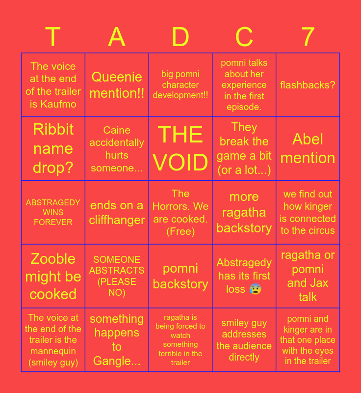 This bingo card has a free space and 24 words: SOMEONE ABSTRACTS (PLEASE NO), something happens to Gangle..., THE VOID, The voice at the end of the trailer is the mannequin (smiley guy), flashbacks?, The voice at the end of the trailer is Kaufmo, Ribbit name drop?, Queenie mention!!, more ragatha backstory, pomni backstory, They break the game a bit (or a lot...), ABSTRAGEDY WINS FOREVER, Abstragedy has its first loss 😰, ragatha or pomni and Jax talk, Caine accidentally hurts someone..., smiley guy addresses the audience directly, we find out how kinger is connected to the circus, big pomni character development!!, Abel mention, ends on a cliffhanger, pomni and kinger are in that one place with the eyes in the trailer, Zooble might be cooked, pomni talks about her experience in the first episode. and ragatha is being forced to watch something terrible in the trailer.