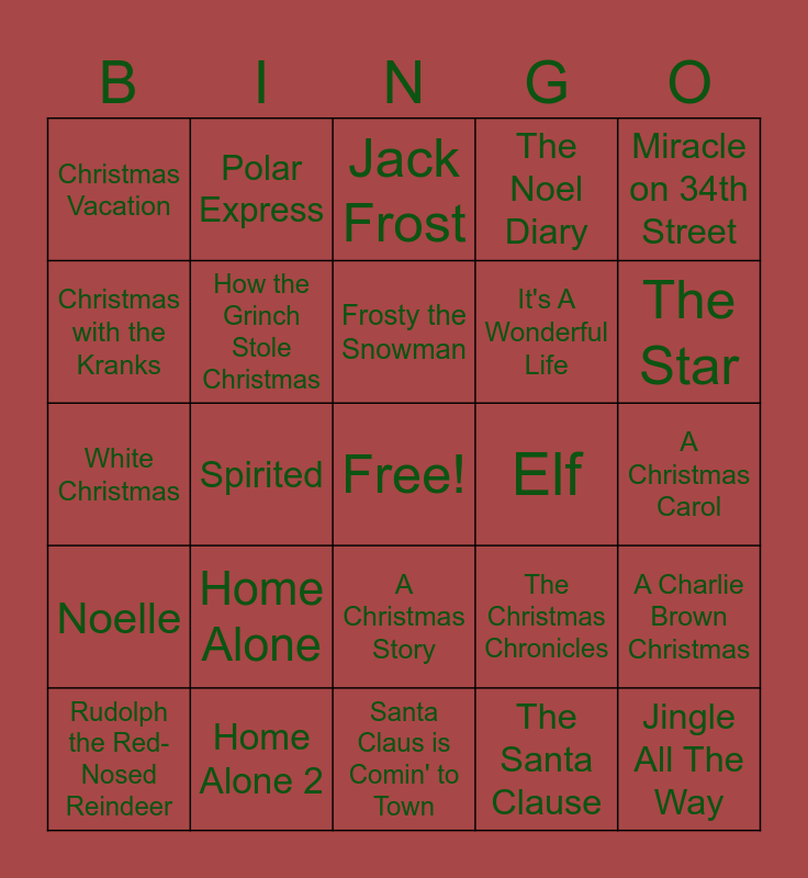 This bingo card has a free space and 24 words: Home Alone, Home Alone 2, Frosty the Snowman, Rudolph the Red-Nosed Reindeer, Miracle on 34th Street, Christmas Vacation, Christmas with the Kranks, Polar Express, Elf, A Christmas Story, It's A Wonderful Life, White Christmas, The Christmas Chronicles, A Charlie Brown Christmas, How the Grinch Stole Christmas, The Santa Clause, A Christmas Carol, Jack Frost, The Star, Spirited, Jingle All The Way, Noelle, The Noel Diary and Santa Claus is Comin' to Town.