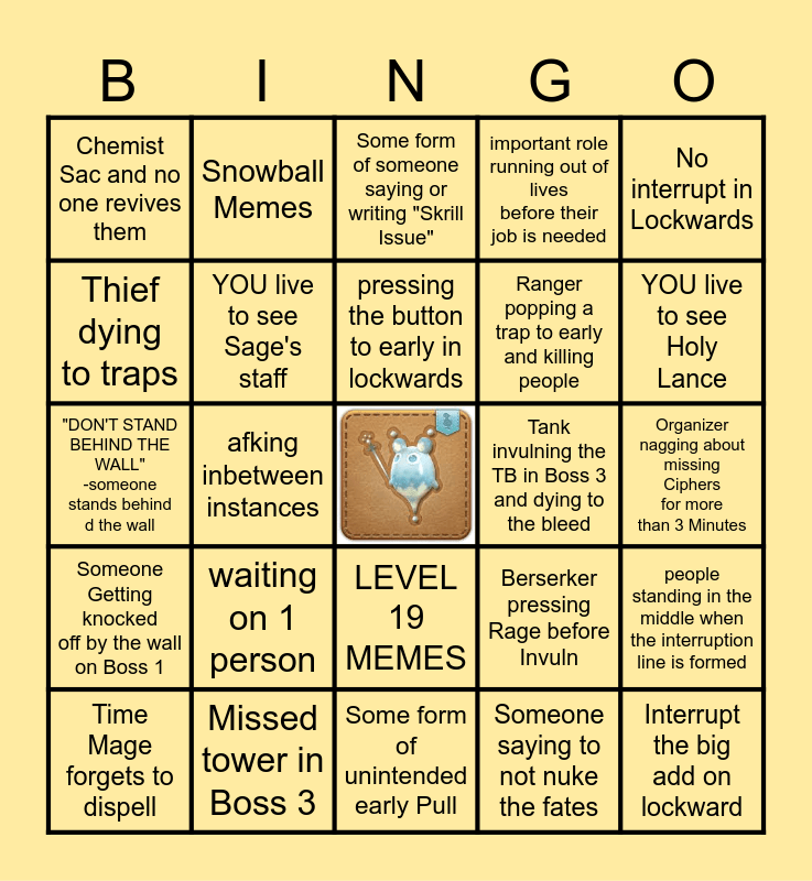 This bingo card has a free space and 24 words: waiting on 1 person, Missed tower in Boss 3, pressing the button to early in lockwards, Time Mage forgets to dispell, No interrupt in Lockwards, Chemist Sac and no one revives them, Thief dying to traps, Snowball Memes, Tank invulning the TB in Boss 3 and dying to the bleed, LEVEL 19 MEMES, Ranger popping a trap to early and killing people, "DON'T STAND BEHIND THE WALL" -someone stands behind d the wall, Berserker pressing Rage before Invuln, people standing in the middle when the interruption line is formed, YOU live to see Sage's staff, Someone saying to not nuke the fates, Organizer nagging about missing Ciphers for more than 3 Minutes, Some form of someone saying or writing "Skrill Issue", YOU live to see Holy Lance, afking inbetween instances, Interrupt the big add on lockward, Someone Getting knocked off by the wall on Boss 1, important role running out of lives before their job is needed and Some form of unintended early Pull.