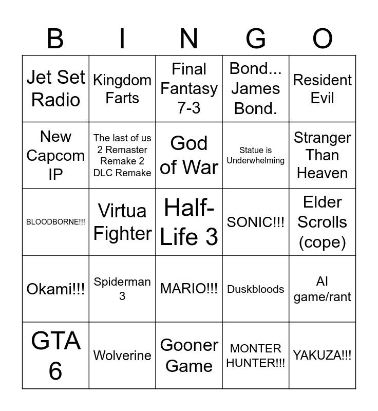 This bingo card has a free space and 24 words: Spiderman 3, Wolverine, God of War, GTA 6, Resident Evil, Jet Set Radio, New Capcom IP, Kingdom Farts, SONIC!!!, MARIO!!!, Statue is Underwhelming, BLOODBORNE!!!, Duskbloods, AI game/rant, The last of us 2 Remaster Remake 2 DLC Remake, MONTER HUNTER!!!, Elder Scrolls (cope), Final Fantasy 7-3, Stranger Than Heaven, Virtua Fighter, YAKUZA!!!, Okami!!!, Bond... James Bond. and Gooner Game.