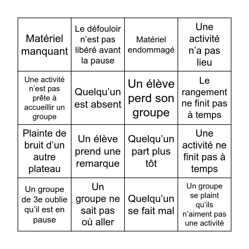 This bingo card has 16 words: Un groupe ne sait pas où aller, Une activité ne finit pas à temps, Matériel endommagé, Matériel manquant, Plainte de bruit d’un autre plateau, Le défouloir n’est pas libéré avant la pause, Quelqu’un part plus tôt, Quelqu’un se fait mal, Une activité n’est pas prête à accueillir un groupe, Quelqu’un est absent, Un groupe de 3e oublie qu’il est en pause, Une activité n’a pas lieu, Un élève prend une remarque, Le rangement ne finit pas à temps, Un élève perd son groupe and Un groupe se plaint qu’ils n’aiment pas une activité.