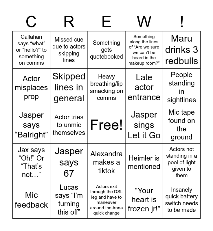 This bingo card has a free space and 24 words: Jasper says 67, Lucas says “I’m turning this off”, Heavy breathing/lip smacking on comms, Mic feedback, Maru drinks 3 redbulls, Callahan says “what” or “hello?” to something on comms, Actor misplaces prop, Missed cue due to actors skipping lines, Jasper sings Let it Go, Alexandra makes a tiktok, Late actor entrance, Jasper says “Balright”, Heimler is mentioned, Actors not standing in a pool of light given to them, Skipped lines in general, “Your heart is frozen jr!”, Mic tape found on the ground, Something gets quotebooked, People standing in sightlines, Actor tries to unmic themselves, Insanely quick battery switch needs to be made, Jax says “Oh!” Or “That’s not…”, Something along the lines of “Are we sure we can’t be heard in the makeup room?” and Actors exit through the DSL leg and have to maneuver around the Anna quick change.