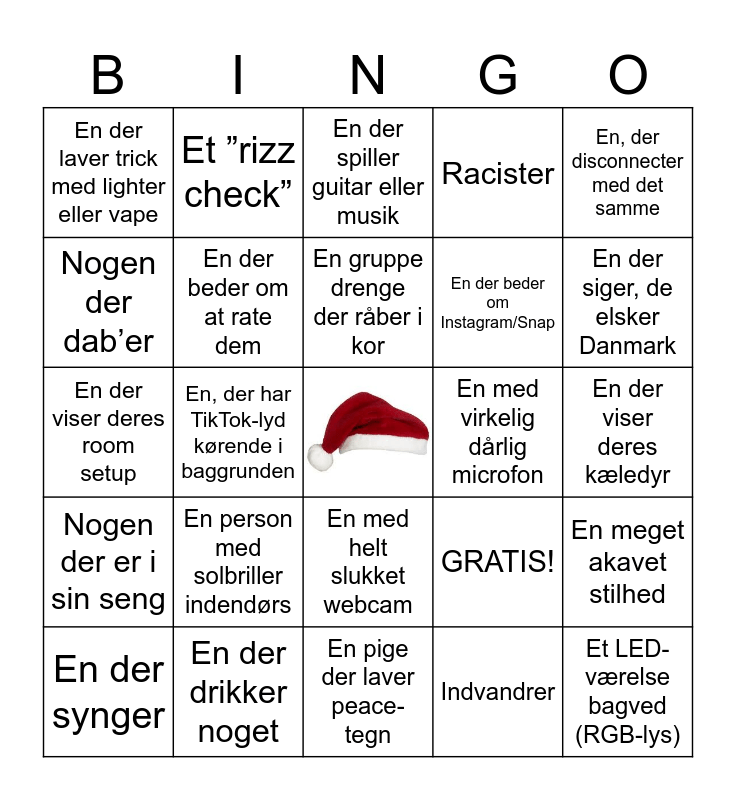 This bingo card has 1 images and 24 words: En person med solbriller indendørs, En pige der laver peace-tegn, En gruppe drenge der råber i kor, En der synger, En, der disconnecter med det samme, En der laver trick med lighter eller vape, Nogen der dab’er, Et ”rizz check”, En med virkelig dårlig microfon, En med helt slukket webcam, En der beder om Instagram/Snap, En der viser deres room setup, GRATIS!, En meget akavet stilhed, En der beder om at rate dem, Et LED-værelse bagved (RGB-lys), En der viser deres kæledyr, En der spiller guitar eller musik, En der siger, de elsker Danmark, En, der har TikTok-lyd kørende i baggrunden, En der drikker noget, Nogen der er i sin seng, Racister and Indvandrer.