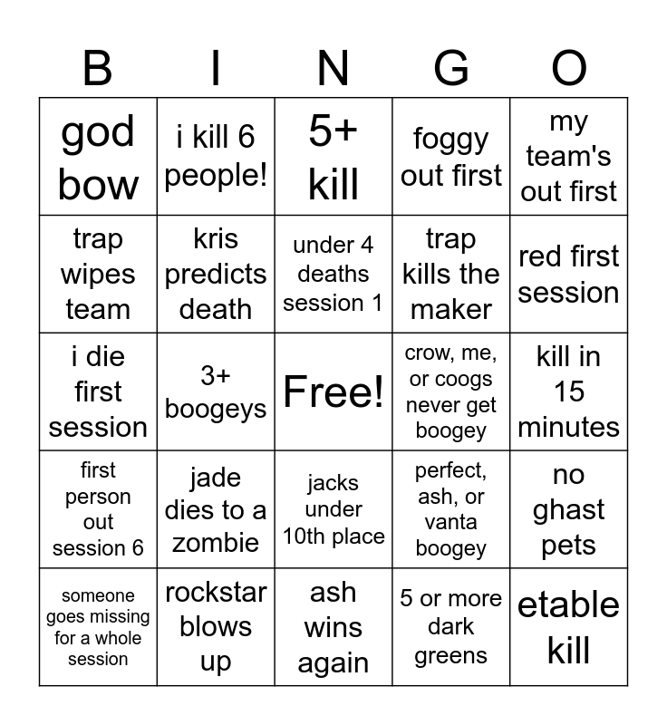 This bingo card has a free space and 24 words: jade dies to a zombie, rockstar blows up, under 4 deaths session 1, someone goes missing for a whole session, my team's out first, god bow, trap wipes team, i kill 6 people!, crow, me, or coogs never get boogey, jacks under 10th place, trap kills the maker, i die first session, perfect, ash, or vanta boogey, no ghast pets, kris predicts death, 5 or more dark greens, kill in 15 minutes, 5+ kill, red first session, 3+ boogeys, etable kill, first person out session 6, foggy out first and ash wins again.