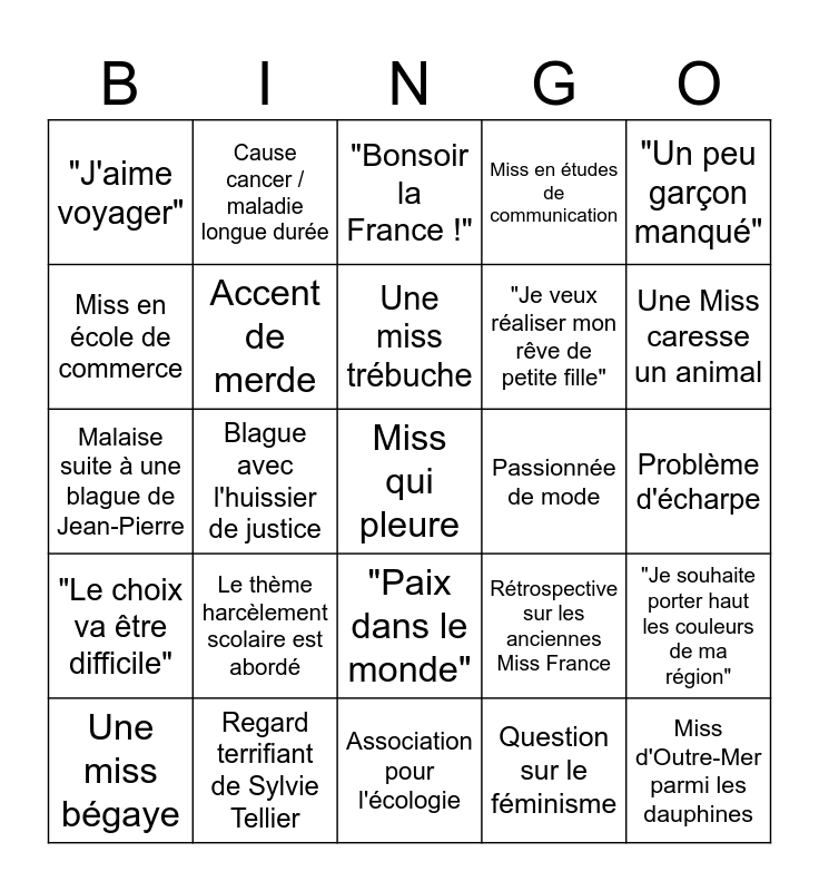 This bingo card has a free space and 24 words: Le thème harcèlement scolaire est abordé, Regard terrifiant de Sylvie Tellier, Une miss trébuche, Une miss bégaye, "Un peu garçon manqué", "J'aime voyager", Miss en école de commerce, Cause cancer / maladie longue durée, Passionnée de mode, "Paix dans le monde", "Je veux réaliser mon rêve de petite fille", Malaise suite à une blague de Jean-Pierre, Rétrospective sur les anciennes Miss France, "Je souhaite porter haut les couleurs de ma région", Accent de merde, Question sur le féminisme, Problème d'écharpe, "Bonsoir la France !", Une Miss caresse un animal, Blague avec l'huissier de justice, Miss d'Outre-Mer parmi les dauphines, "Le choix va être difficile", Miss en études de communication and Association pour l'écologie.