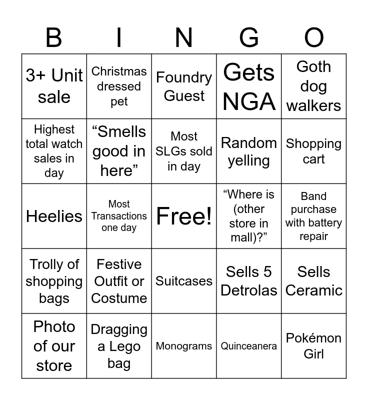 This bingo card has a free space and 45 words: CD player Girl, Pokémon Girl, “I’m from Michigan”, Photo of our store, “I have small wrists”, Quinceanera, Foundry Guest, Filson Watch Repair, Goth dog walkers, Dragging a Lego bag, Gets NGA, “Where is (other store in mall)?”, Suitcases, Festive Outfit or Costume, Sizes a watch, Monograms, Gift Wraps 2+ Watches, Heelies, Neck brace or cast, Shopping cart, Christmas dressed pet, Sells Fine Jewelry, Sells seasonal leather, 3+ Unit sale, 2+ watch sale, Band purchase with battery repair, Sells last mooncraft, Sells Red/Green watch, Sells 5 Detrolas, Trolly of shopping bags, See a Santa, Sells Ceramic, Sells a game set, Highest Daily sale, Highest AOV, Most Transactions one day, Most transactions $495+, Highest SPH in 1 Day, Most journals sold in day, Most SLGs sold in day, Highest total watch sales in day, Random yelling, Mall event, “Smells good in here” and “Are those cigars?” (strap).