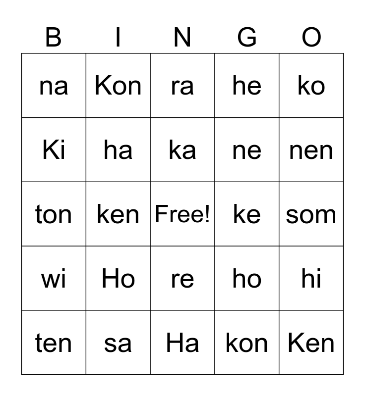 This bingo card has a free space and 50 words: Ka, Ken, He, Ha, Ho, Ke, Kon, Hi, Ki, Ko, ha, he, hi, ho, hen, hon, ka, ke, ki, ko, ken, kon, na, ne, ni, no, nen, non, ra, re, ri, ro, ren, ron, sa, se, si, so, sen, som, ta, te, ti, to, ten, ton, wa, we, wi and wen.