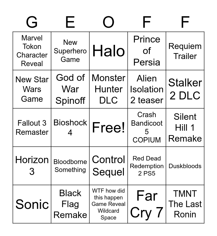 This bingo card has a free space and 24 words: Bloodborne Something, Black Flag Remake, Monster Hunter DLC, Sonic, Requiem Trailer, Marvel Tokon Character Reveal, New Star Wars Game, New Superhero Game, Crash Bandicoot 5 COPIUM, Control Sequel, Alien Isolation 2 teaser, Fallout 3 Remaster, Red Dead Redemption 2 PS5, Duskbloods, God of War Spinoff, Far Cry 7, Silent Hill 1 Remake, Halo, Stalker 2 DLC, Bioshock 4, TMNT The Last Ronin, Horizon 3, Prince of Persia and WTF how did this happen Game Reveal Wildcard Space.