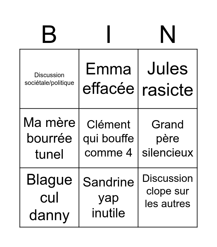 This bingo card has a free space and 8 words: Ma mère bourrée tunel, Emma effacée, Grand père silencieux, Blague cul danny, Jules rasicte, Discussion sociétale/politique, Sandrine yap inutile and Discussion clope sur les autres.