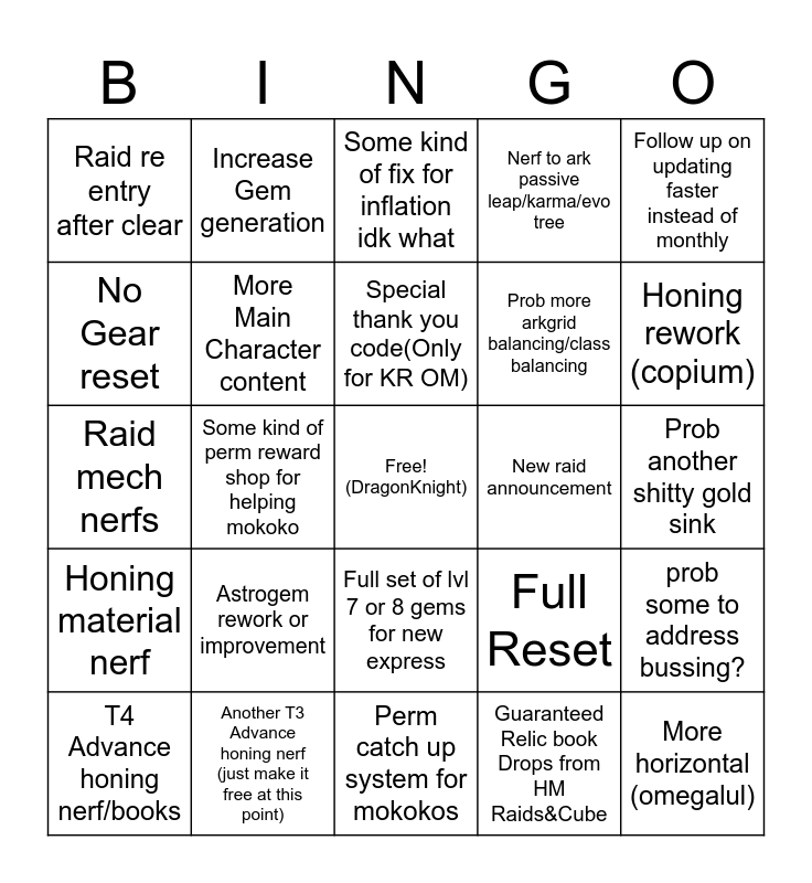 This bingo card has a free space and 24 words: Astrogem rework or improvement, Another T3 Advance honing nerf (just make it free at this point), Special thank you code(Only for KR OM), T4 Advance honing nerf/books, Follow up on updating faster instead of monthly, Raid re entry after clear, No Gear reset, Increase Gem generation, New raid announcement, Full set of lvl 7 or 8 gems for new express, Prob more arkgrid balancing/class balancing, Raid mech nerfs, Full Reset, prob some to address bussing?, More Main Character content, Guaranteed Relic book Drops from HM Raids&Cube, Prob another shitty gold sink, Some kind of fix for inflation idk what, Honing rework (copium), Some kind of perm reward shop for helping mokoko, More horizontal (omegalul), Honing material nerf, Nerf to ark passive leap/karma/evo tree and Perm catch up system for mokokos.