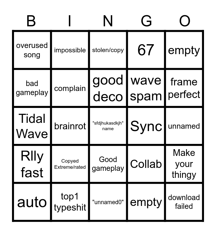 This bingo card has a free space and 24 words: Copyed Extreme/rated, top1 typeshit, good deco, auto, empty, overused song, bad gameplay, impossible, Sync, Good gameplay, wave spam, Tidal Wave, Collab, Make your thingy, complain, empty, unnamed, stolen/copy, frame perfect, brainrot, download failed, Rlly fast, 67 and "unnamed0".