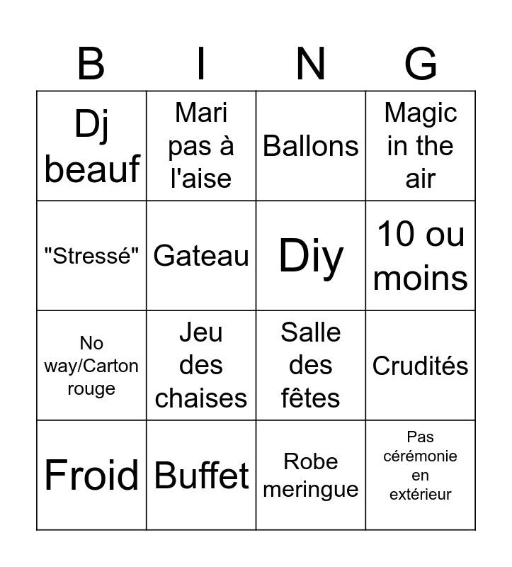 This bingo card has 16 words: Buffet, Crudités, Ballons, Dj beauf, No way/Carton rouge, Mari pas à l'aise, Salle des fêtes, Robe meringue, "Stressé", Gateau, Froid, Magic in the air, Jeu des chaises, 10 ou moins, Diy and Pas cérémonie en extérieur.