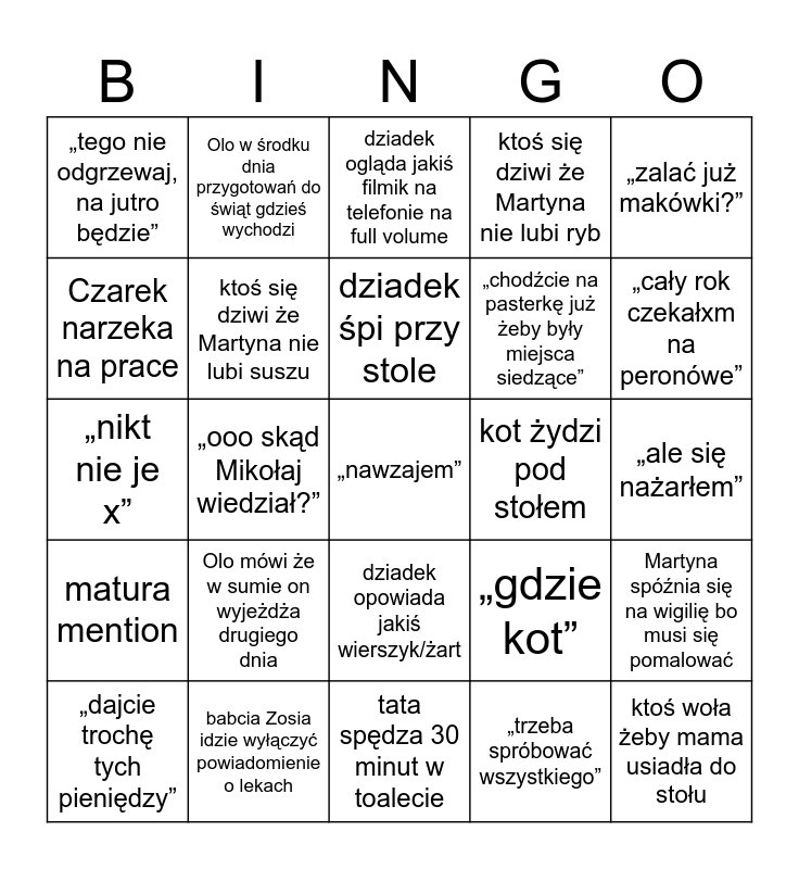 This bingo card has a free space and 50 words: mama pyta się czy na pewno wszystkim smakuje, ktoś woła żeby mama usiadła do stołu, mama szuka komórki, tata spędza 30 minut w toalecie, Olo mówi że w sumie on wyjeżdża drugiego dnia, Olo i Czarek cytują jakiś filmik z youtuba sprzed 20 lat, Olo w środku dnia przygotowań do świąt gdzieś wychodzi, Czarek mówi że w każde święta coraz mniej jemy, Czarek narzeka na prace, Czarek narzeka że nie wyszło mu jedzenie które on ugotował, ktoś się dziwi że Martyna nie lubi suszu, ktoś się dziwi że Martyna nie lubi ryb, Martyna spóźnia się na wigilię bo musi się pomalować, „gdzie kot”, babcia Zosia mówi że Ola i Michał są dłużej w Dobrzyńcu, „no dobra zaczynamy już?’’, dziadek śpi przy stole, kot żydzi pod stołem, „nie dawaj kotu”, „zalać już makówki?”, „ooo skąd Mikołaj wiedział?”, „trzeba spróbować wszystkiego”, „tego nie odgrzewaj, na jutro będzie”, „chodźcie na pasterkę już żeby były miejsca siedzące”, „smażyć już pierogi?”, „już nie robią kwaśnej kapusty”, „cały rok czekałxm na peronówe”, ktoś woła dziadka żeby przyszedł do nas na kanapę, dziadek ogląda jakiś filmik na telefonie na full volume, dziadek opowiada jakiś wierszyk/żart, babcia/dziadek opowiada jakaś historie z życia sprzed 20 lat, babcie gadają o jakieś pani z kościoła, kostka mention, brama mention, babcia Zosia idzie wyłączyć powiadomienie o lekach, ktoś rozlewa barszcz, „po co wam taka wielka choinka”, „kto to tak ładnie choinkę ubrał?”, wszyscy kłócą się o ubieranie choinki, „ale się nażarłem”, Prążka wchodzi do stajenki, „Prążka powiedz coś ludzkim głosem”, dziadek pyta się ile można czekać, Wiązowna mówi że cały dzień nie jedli, „dajcie trochę tych pieniędzy”, „nikt nie je x”, „chyba x się utopił w tym kibelku”, prawo jazdy mention, matura mention and studia Olgierda mention.