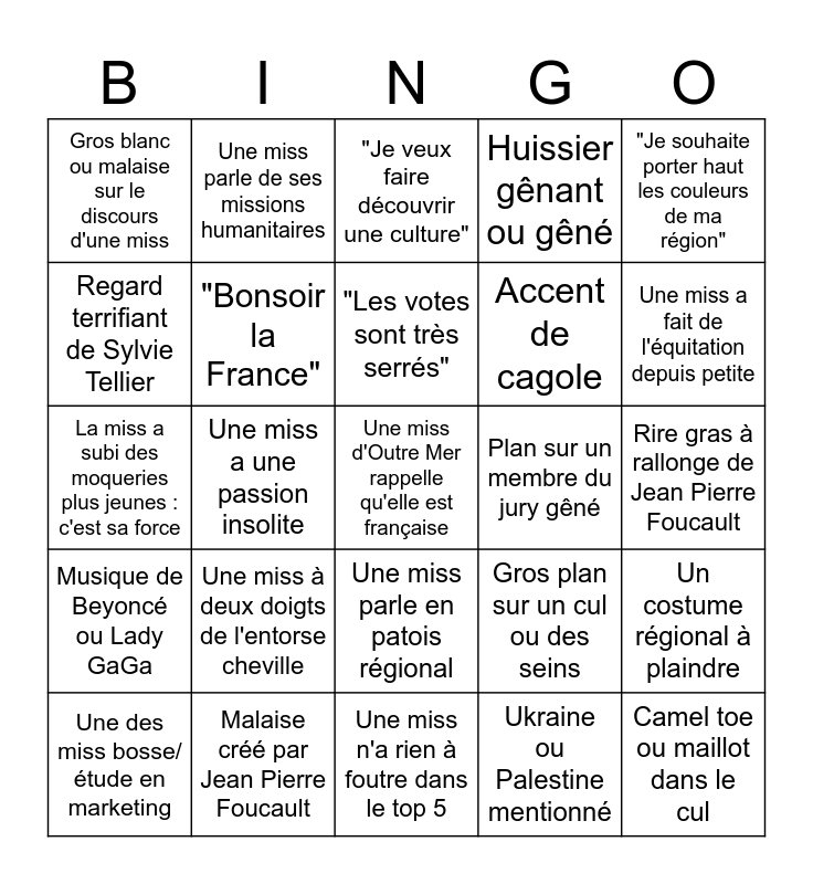 This bingo card has a free space and 24 words: Une miss à deux doigts de l'entorse cheville, Malaise créé par Jean Pierre Foucault, "Les votes sont très serrés", Une des miss bosse/étude en marketing, "Je souhaite porter haut les couleurs de ma région", Gros blanc ou malaise sur le discours d'une miss, Regard terrifiant de Sylvie Tellier, Une miss parle de ses missions humanitaires, Plan sur un membre du jury gêné, Une miss parle en patois régional, Accent de cagole, La miss a subi des moqueries plus jeunes : c'est sa force, Gros plan sur un cul ou des seins, Un costume régional à plaindre, "Bonsoir la France", Ukraine ou Palestine mentionné, Rire gras à rallonge de Jean Pierre Foucault, "Je veux faire découvrir une culture", Une miss a fait de l'équitation depuis petite, Une miss a une passion insolite, Camel toe ou maillot dans le cul, Musique de Beyoncé ou Lady GaGa, Huissier gênant ou gêné and Une miss n'a rien à foutre dans le top 5.