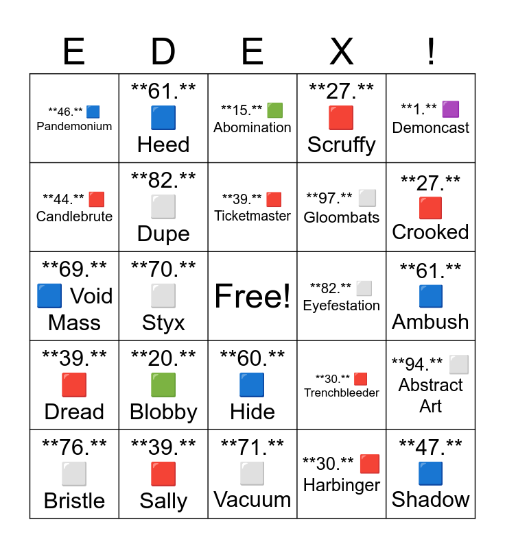 This bingo card has a free space and 104 words: **1.** πͺ Sebastian Solace, **1.** πͺ Guiding Light, **1.** πͺ Demoncast, **4.** π¨ Seek, **5.** π¨ Curious Light, **6.** π¨ p.AI.nter, **6.** π¨ Navi-AI, **8.** π¨ Figure, **8.** π¨ Jeff, **10.** π¨ Queen Maskof (Maskof (P)-X), **11.** π© Shock, **11.** π© Searchlights, **13.** π© Groundskeeper, **13.** π© The Stalker, **15.** π© Bramble, **15.** π© Grumble, **15.** π© Abomination, **15.** π© El Goblino, **19.** π© Glitch, **20.** π© Bob, **20.** π© Soldier Maskof (Maskof (M)-X), **20.** π© Dozer, **20.** π© DJ Skeletunes, **20.** π© Haste, **20.** π© Firewall, **20.** π© Blobby, **27.** π₯ Crooked, **27.** π₯ Scruffy, **27.** π₯ And-Life Stealer, **30.** π₯ Eyestalk, **30.** π₯ Trenchbleeder, **30.** π₯ Harbinger, **33.** π₯ Grampy, **33.** π₯ Deep Sea Bunny, **33.** π₯ Bouncer, **33.** π₯ Valcula Void Mass, **33.** π₯ Fade, **33.** π₯ Louie, **39.** π₯ Ticketmaster, **39.** π₯ Sally, **39.** π₯ Imaginary Friend, **39.** π₯ Dread, **43.** π₯ Void, **44.** π₯ Candlebrute, **45.** π₯ A-120, **46.** π¦ Pandemonium, **47.** π¦ Man From The Mindscape, **47.** π¦ Shadow, **49.** π¦ Bottomfeeder, **49.** π¦ Skelepede, **51.** π¦ Halt, **51.** π¦ Candlebearer, **51.** π¦ Jack, **51.** π¦ Glidefin, **55.** π¦ DiVine, **55.** π¦ Monument, **55.** π¦ KooKoo, **58.** π¦ Rebarb, **58.** π¦ Stoneheart, **60.** π¦ Hide, **61.** π¦ Ambush, **61.** π¦ Ire, **61.** π¦ Chainsmoker, **61.** π¦ Blitz (Pressure), **61.** π¦ Surge, **61.** π¦ Mirage, **61.** π¦ Maskof-V, **61.** π¦ Heed, **69.** π¦ Void Mass, **70.** β¬ Styx, **71.** β¬ Vacuum, **71.** β¬ Or-Life Stealer, **73.** β¬ Blitz (Doors), **73.** β¬ A-60, **75.** β¬ Lookman, **76.** β¬ Spikeroller, **76.** β¬ A-90, **76.** β¬ Bristle, **76.** β¬ Timothy, **76.** β¬ Wall Dweller, **76.** β¬ Doppel, **82.** β¬ Rush, **82.** β¬ Dupe, **82.** β¬ Pipsqueak, **82.** β¬ Eyefestation, **82.** β¬ Slight, **82.** β¬ Mask of Sadness, **82.** β¬ Snare, **82.** β¬ Embergaze, **82.** β¬ Counterfeit, **82.** β¬ Corpse Tree, **92.** β¬ Pinkie, **92.** β¬ Froger, **94.** β¬ Abstract Art, **95.** β¬ Mandrake, **95.** β¬ X-400, **97.** β¬ Eyes, **97.** β¬ Gloombats, **97.** β¬ Squiddles, **97.** β¬ Angler, **101.** β¬ Caws, **102.** β¬ Screech, **102.** β¬ Giggle and **104.** β¬ Maskof.