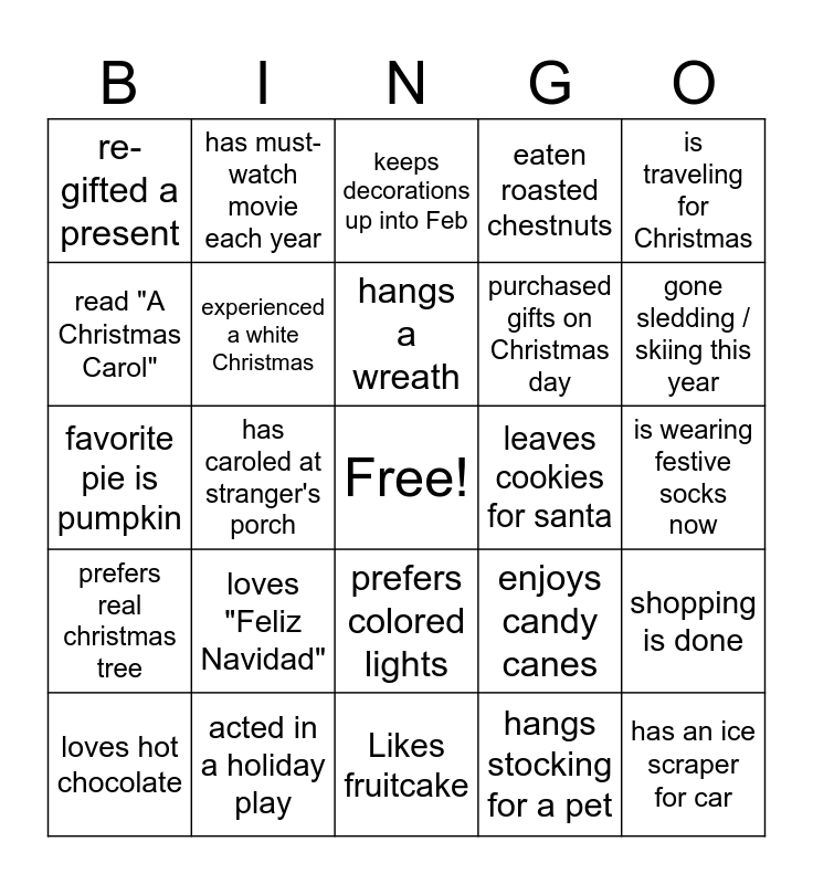 This bingo card has a free space and 32 words: hangs stocking for a pet, has sent christmas cards out, has caroled at stranger's porch, likes egg nog, prefers real christmas tree, experienced a white Christmas, is traveling for Christmas, shopping is done, has must-watch movie each year, decorates before Thanksgiving, hangs a wreath, keeps decorations up into Feb, has gone out just to see lights, has shoveled snow, leaves cookies for santa, has built a snowman, loves hot chocolate, favorite pie is pumpkin, prefers colored lights, loves "Feliz Navidad", enjoys candy canes, prefers original Grinch movie, is wearing festive socks now, acted in a holiday play, has an ice scraper for car, eaten roasted chestnuts, purchased gifts on Christmas day, read "A Christmas Carol", re-gifted a present, Likes fruitcake, built a snow cave / igloo and gone sledding / skiing this year.
