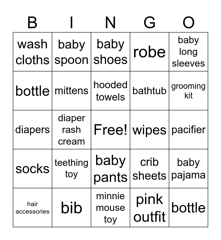 This bingo card has a free space and 24 words: teething toy, bib, hooded towels, hair accessories, baby long sleeves, wash cloths, bottle, baby spoon, wipes, baby pants, bathtub, diapers, crib sheets, baby pajama, mittens, pink outfit, pacifier, baby shoes, grooming kit, diaper rash cream, bottle, socks, robe and minnie mouse toy.